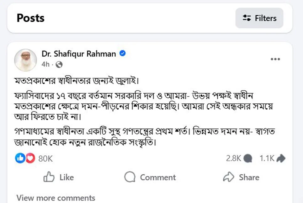 পোস্টে জামায়াত আমির আরও বলেন- “মতপ্রকাশের স্বাধীনতার জন্যই জুলাই।