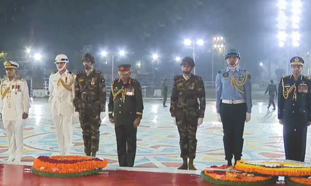 নিজস্ব প্রতিবেদক: মহান শহীদ দিবস ও আন্তর্জাতিক মাতৃভাষা দিবসের প্রথম প্রহরে কেন্দ্রীয় শহীদ মিনারে পুষ্পস্তবক অর্পণের মাধ্যমে ভাষা শহীদদের প্রতি গভীর শ্রদ্ধা নিবেদন করেছেন তিন বাহিনীর প্রধানরা।