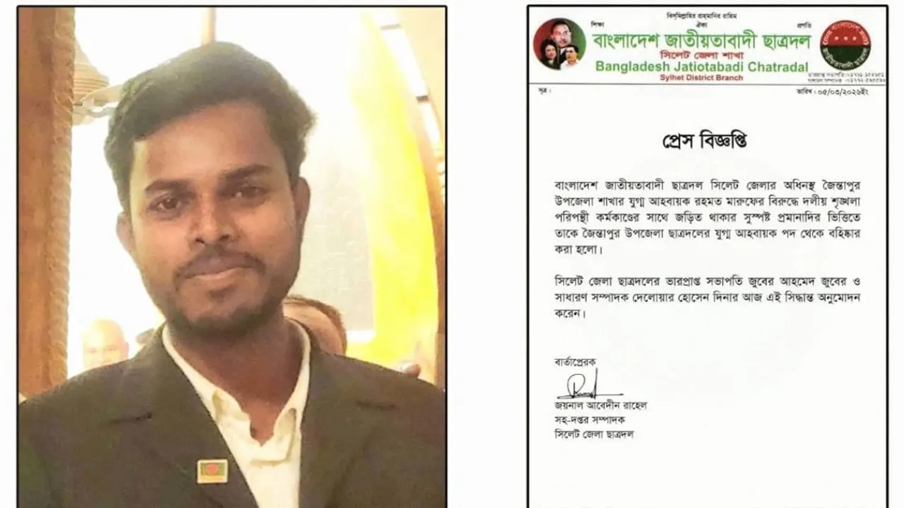 বিজ্ঞপ্তিতে বলা হয়, জৈন্তাপুর উপজেলা ছাত্রদলের যুগ্ম আহ্বায়ক রহমত মারুফের বিরুদ্ধে দলীয় শৃঙ্খলাবিরোধী কর্মকাণ্ডে জড়িত থাকার সুস্পষ্ট প্রমাণ পাওয়ায় তাকে ওই পদ থেকে বহিষ্কার করা হয়েছে।